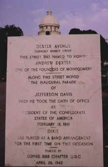 Dexter Avenue is a famous street in Montgomery. This plaque commemorates the inaugural parade for Jefferson Davis, the first president of the Confederacy. In December of 1954, Rosa Parks boarded a city bus on Dexter Avenue. An African-American, Mrs. Parks obeyed the law and took an empty seat toward the back of the bus. It was the Christmas shopping season and the bus was crowded. |