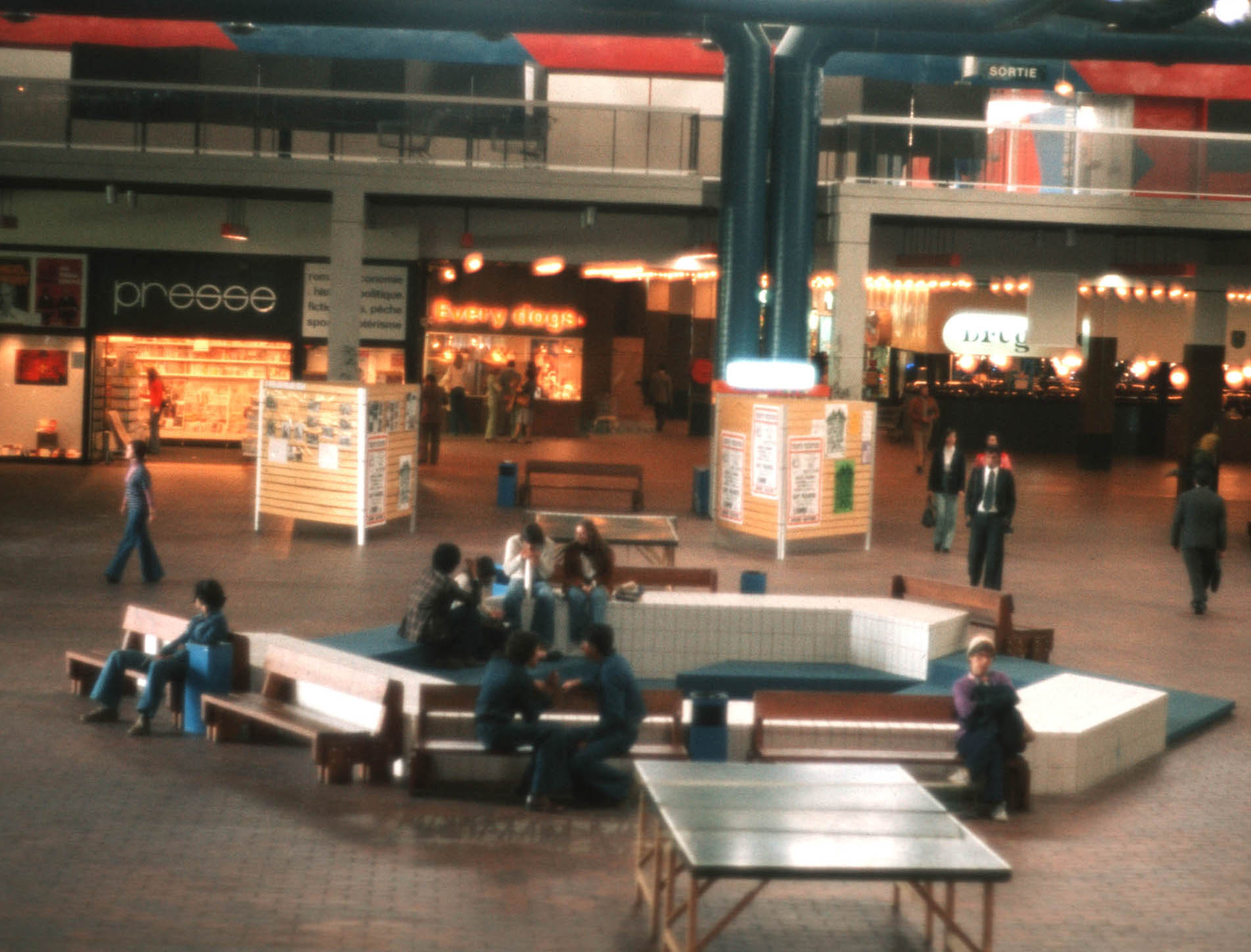 Connected to the shopping center at Evry 2 is the entertainment center, which includes a number of movie theaters, a bowling alley, and athletic and recreational facilities. This is a sitting area, complete with two ping-pong tables, at the entertainment center. |