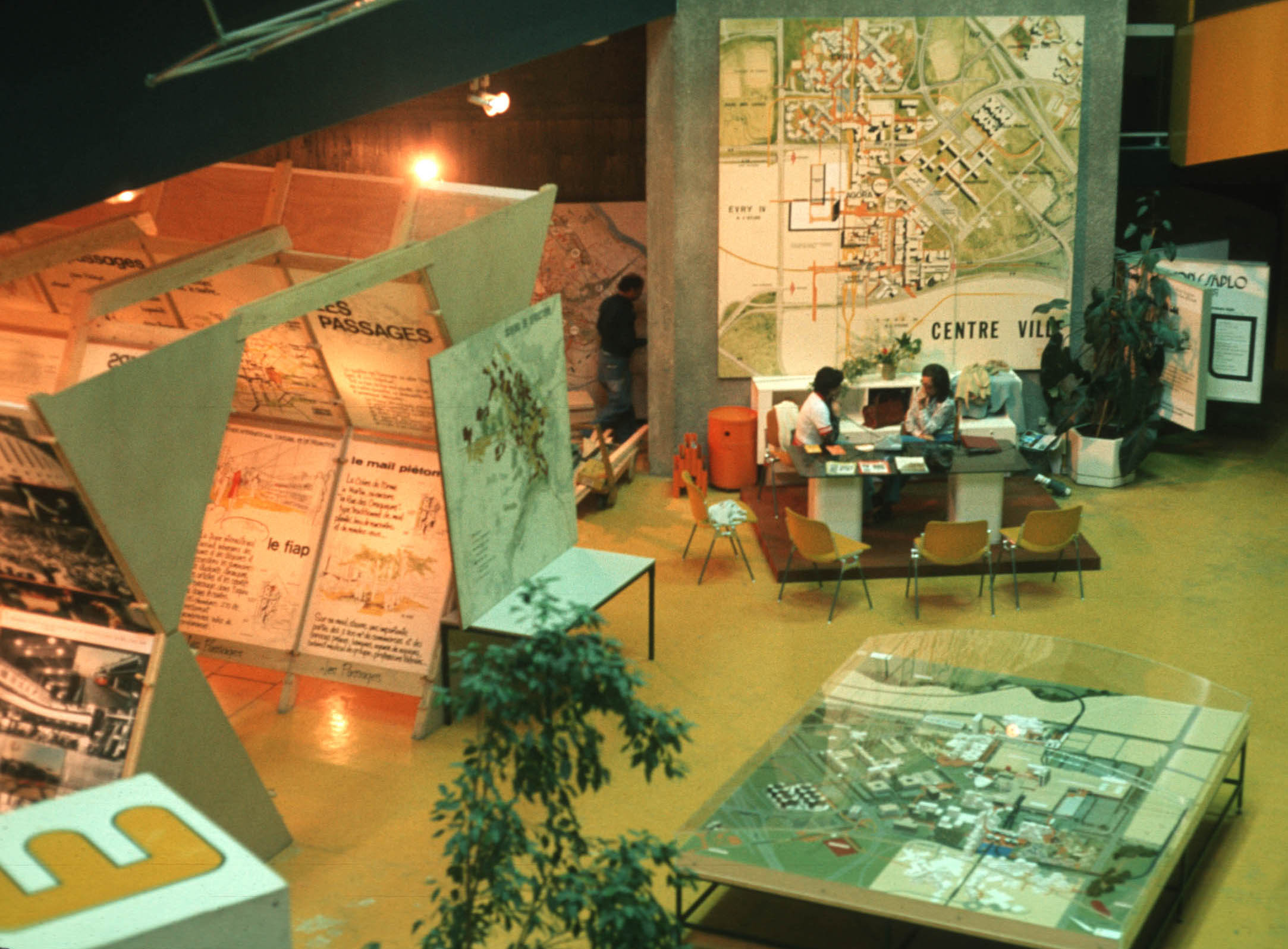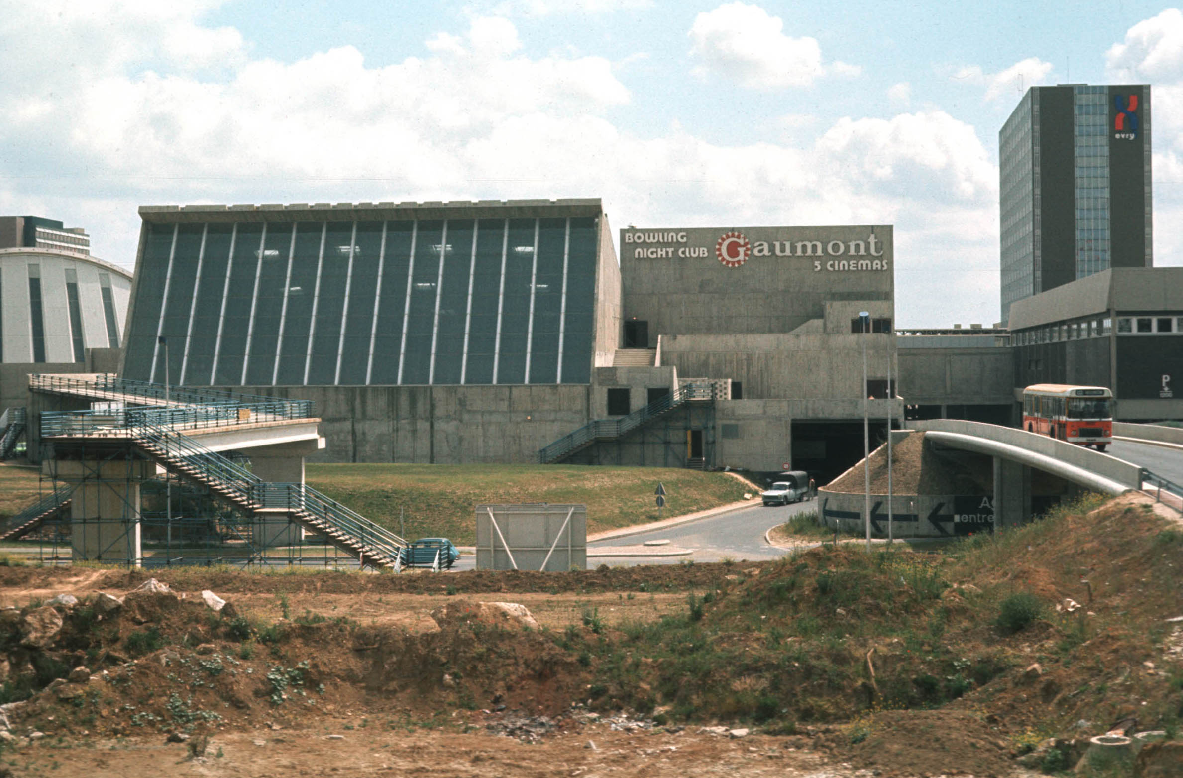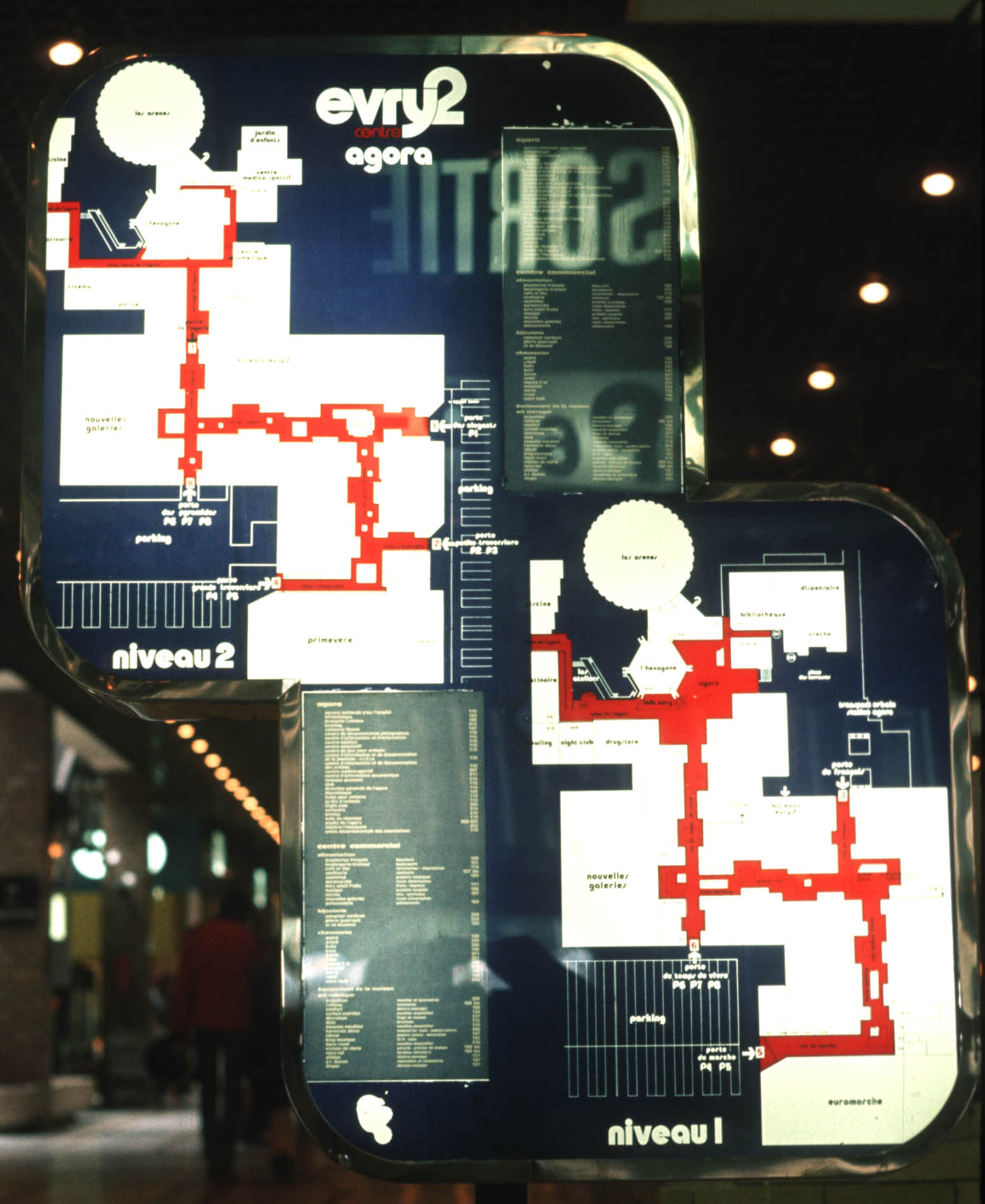 A map of both levels of the city center at Evry 2. The goal is to combine work, shopping, entertainment, and physical recreation in the same central area, with convenient parking, frequent bus service, and good pedestrian access to nearby residential areas. |