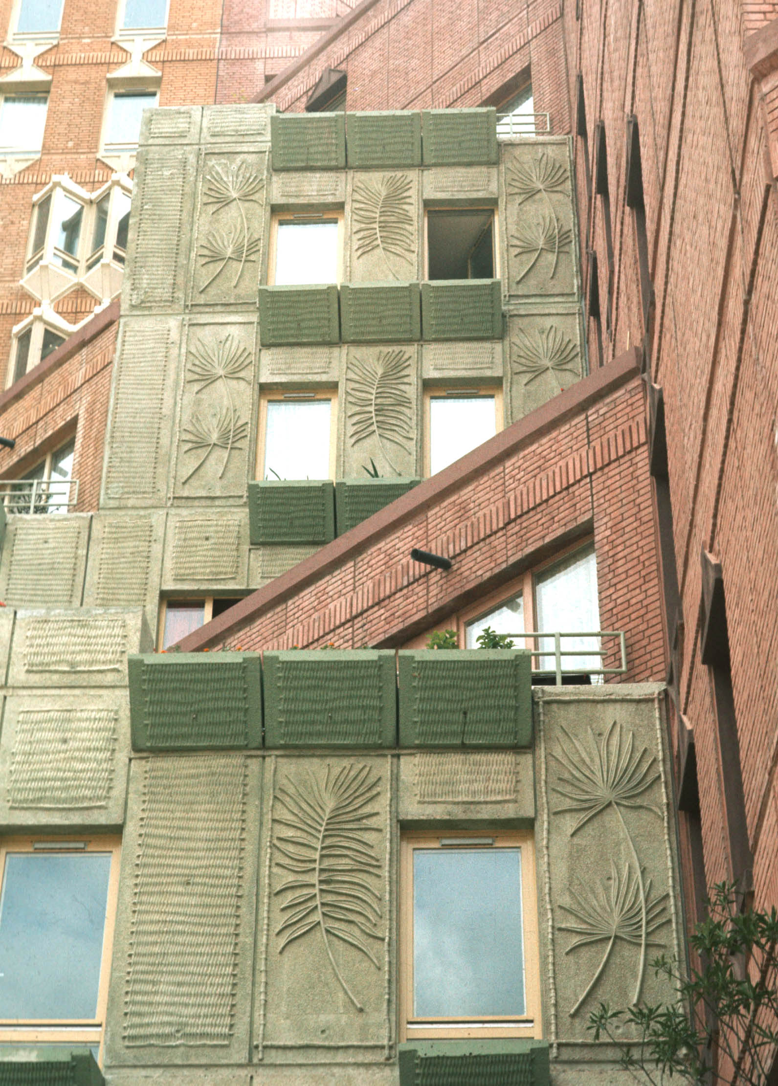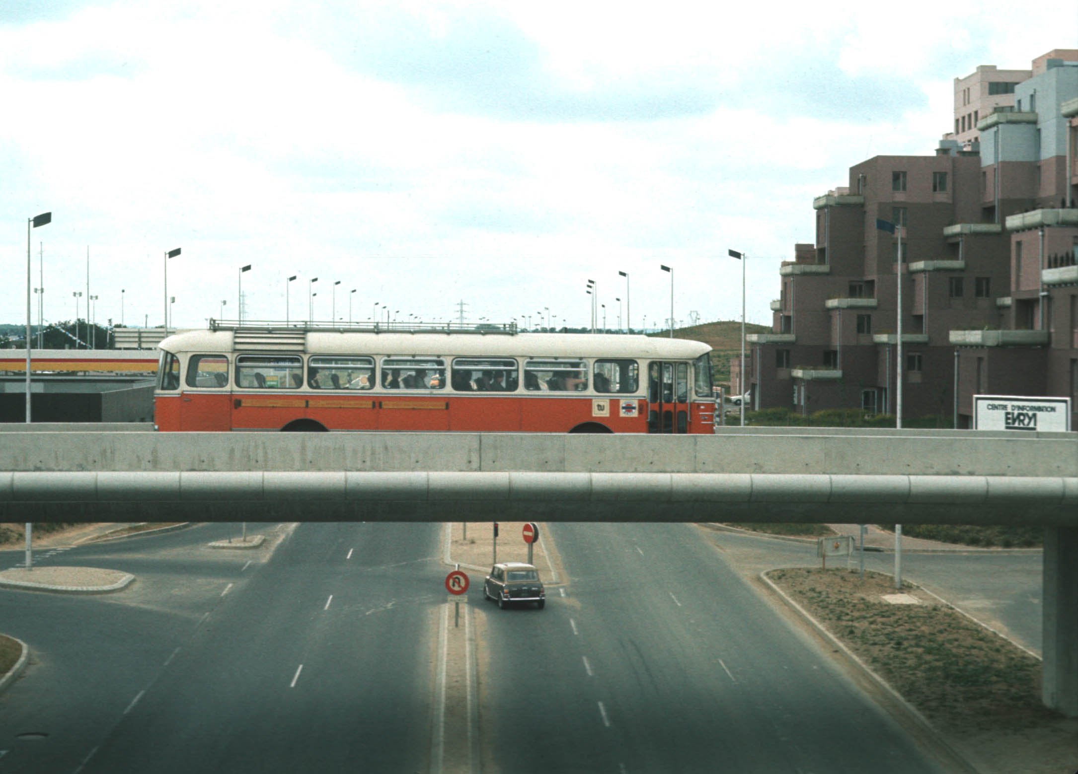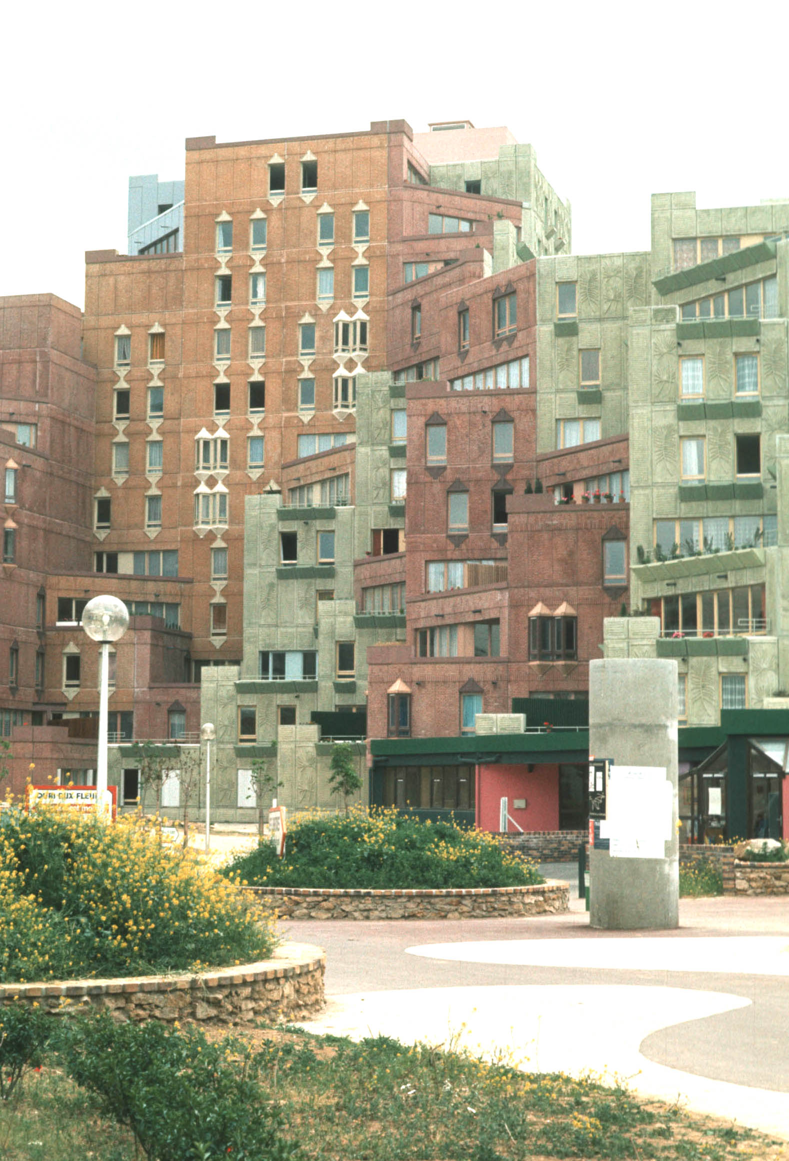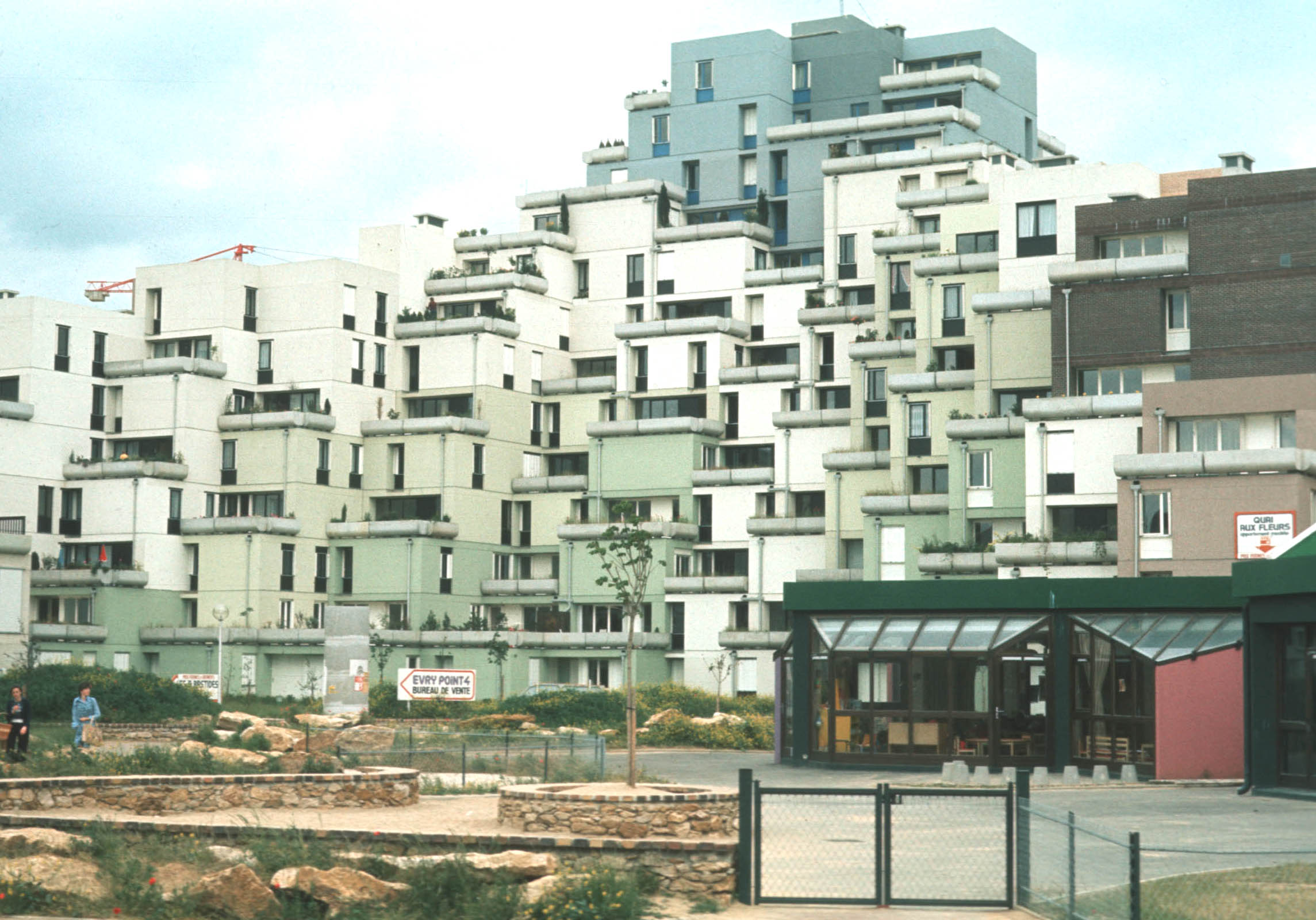 A high-rise residential area at Evry. All the new-town design themes are represented: an interesting art pattern in the paved walkways, a characteristic street light, and vegetation in raised planters. The architect has worked to make the buildings more interesting (this is not a glass and metal box) by angling the outside walls and using multiple surfaces and colors on the outside walls. |