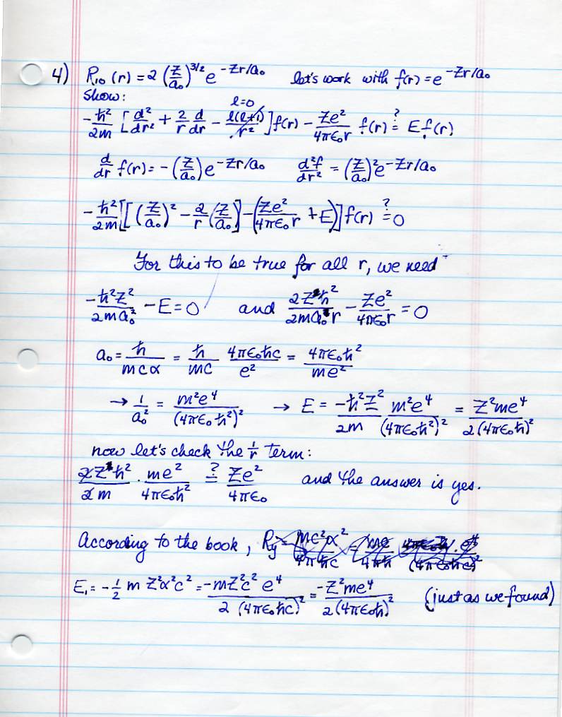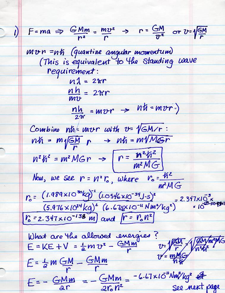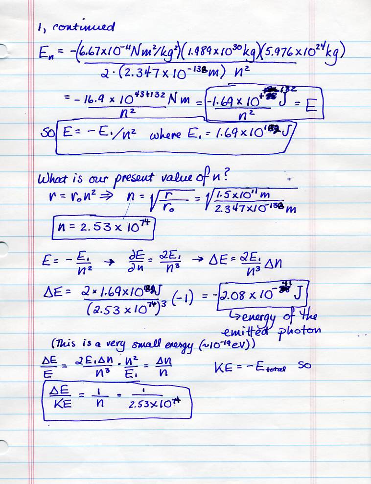 Test 2: On the first question, please note that you're asked about the transition from the current value of n to a value of n that is one less than the current value. (That's what I mean by the n-1 state.) And I don't want anyone to tell me that the energy of the emitted photon is zero. Also, you're all entitled to know that the gravitational force is G M m / r^2 and the gravitational potential energy is -G M m / r.