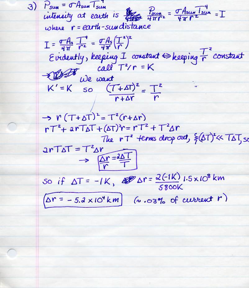Test 1: On problem 3, please note that the change in the sun's temperature is small, and so is the change in the radius of the earth's orbit. Also, yes, I mean for you to find a general expression for delta-r, and then to plug in numbers for the last part of the question. Also, you're allowed to use the result from class, that power is a constant times the surface area times temperature to the fourth power.